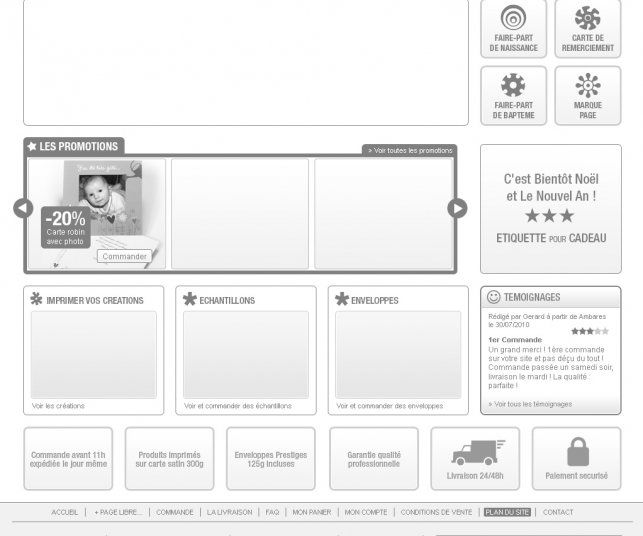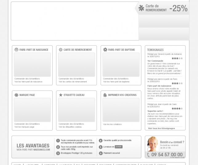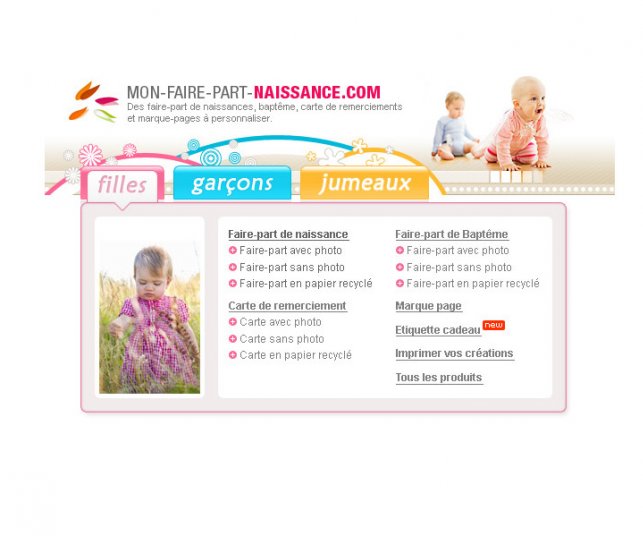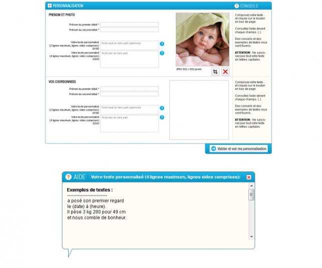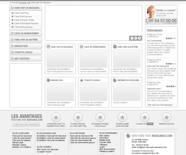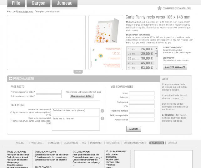 Le site mon‐faire‐par‐naissance.com est constitué de deux Urls, une pour l'information et le référencement et une seconde pour les commandes en ligne. Le site de commande est administré par un module CMS Printflux qui propose des fonctions de personnalisation.