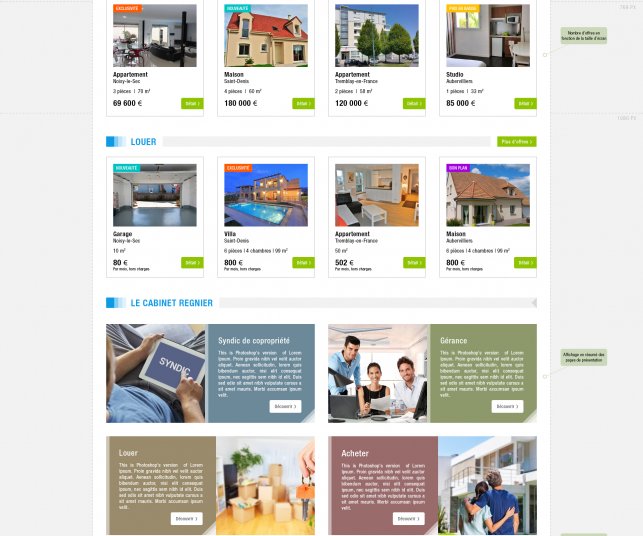 Les pages catégories du site Internet syndic du cabinet Regnier sont composées de deux parties. La partie la plus importante des pages catégories recense un résumé de tous les biens immobiliers à la vente et à la location disponible au sein de l’agence immobilière. Avec cette disposition, le client peut ainsi obtenir les informations les plus importantes concernant le bien figurant sur le site à savoir le tarif, la ville, le nombre de pièces et le nombre de mètres carrés. Si celui-ci souhaite en savoir plus il ne lui reste plus qu’à cliquer sur le petit bouton découvrir situé juste en dessous de la description du bien.