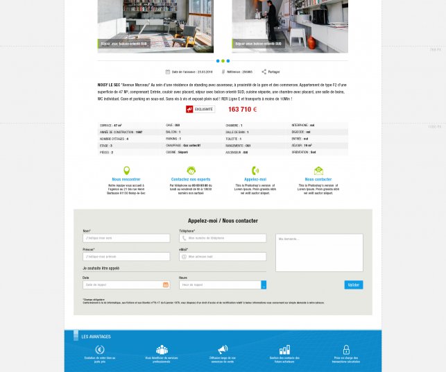 Les pages « annonces » du site Internet syndic sont toutes composées de la même façon, elles sont divisées en quatre parties. La première partie expose les photos du bien immobilier en question, juste en dessous, dans la deuxième partie de la page, l’internaute pourra retrouver le descriptif détaillé du bien immobilier par lequel il est intéressé. Un peu plus en dessous, dans la troisième partie de la page nous avons intégré un bandeau rappelant aux clients tous les moyens de communication dont ils disposent pour contacter le cabinet Regnier, sans oublier la dernière partie de la page annonce sur laquelle figure un formulaire de contact.