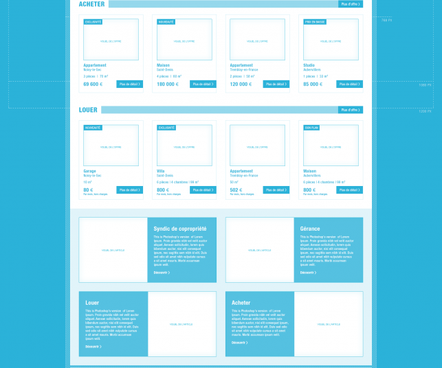 - Juste en dessous, dans la deuxième partie de la page d’accueil les utilisateurs peuvent accéder facilement à toutes les offres immobilières présentes sur le site Internet que ce soit pour de la location ou de l’achat de biens immobiliers. Les nouveautés et les exclusivités sont mises en avant sur cette partie.