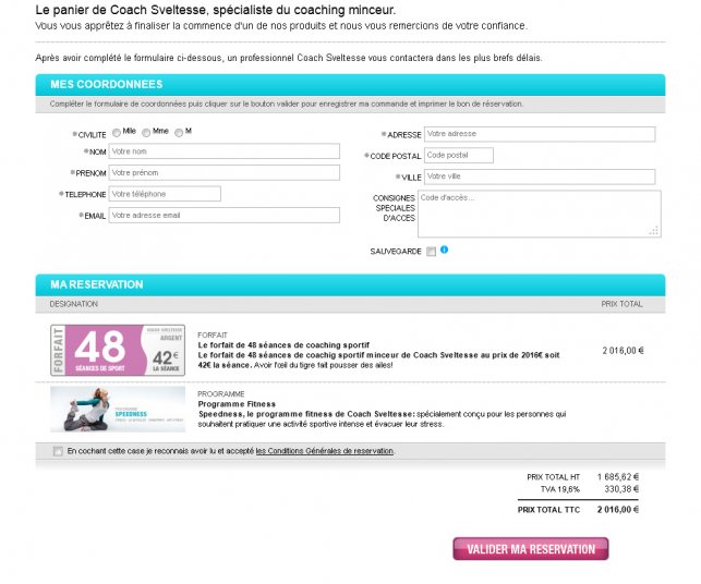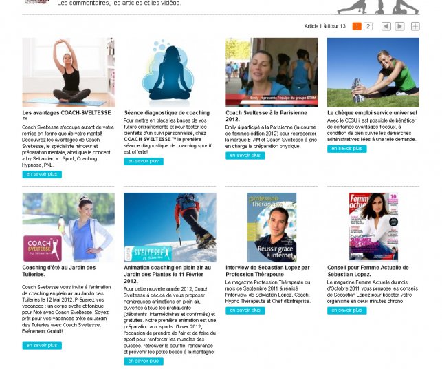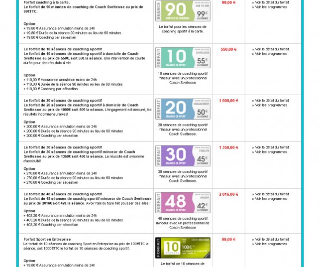 Le site coach Sveltesse propose un catalogue de forfaits de sport, des programmes de sport, des pages et articles sur le sport à domicile, des pages de présentations d'activité ainsi que la possibilité de réserver un forfait de sport en ligne avec un formulaire et un mini panier.